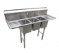 Deli/Convenient Store Sink, three compartment, 58"W x 19-1/2"D x 45-1/2"H, 18/304 stainless steel, 10" wide x 14" front-to-back x 10" deep compartments, 12" drainboards on left & right, 9"H backsplash, 8" OC splash mount faucet holes, 3-1/2" basket drains with 1-1/2" outlets, stainless steel gussets, stainless steel legs & side cross-bracing with stainless steel adjustable bullet feet, NSF