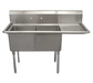Serv-Ware - Sinks - 14" Deep Economy Sink 2 Bowl - 56.5"W x 23.5"D x 45.5"H, 18/304 stainless steel, (2) 18" wide x 18" front-to-back x 14" deep compartments, 18" drainboard on right, 11-3/4"H backsplash, 8" OC splash mount faucet holes, raised rolled edges on front & sides, 3-1/2" basket drains with 1-1/2" outlets, stainless steel gussets, galvanized steel legs with adjustable bullet feet, NSF