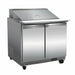 Mega Sandwich/Salad Prep Table, two-section, 36-1/5”W x 29-9/10”D x 43-1/5”H, 7 cu. ft. capacity, (2) self-closing solid doors, full length handles, (2) epoxy coated shelves, includes: (15) plastic pans & cutting board, electronic thermostat, LED digital display, auto defrosting & evaporation, stainless steel exterior, ABS interior with stainless steel floor, rear mounted self-contained refrigeration, R290 Hydrocarbon refrigerant, (4) casters (2 braked), cETLus, ETL-Sanitation